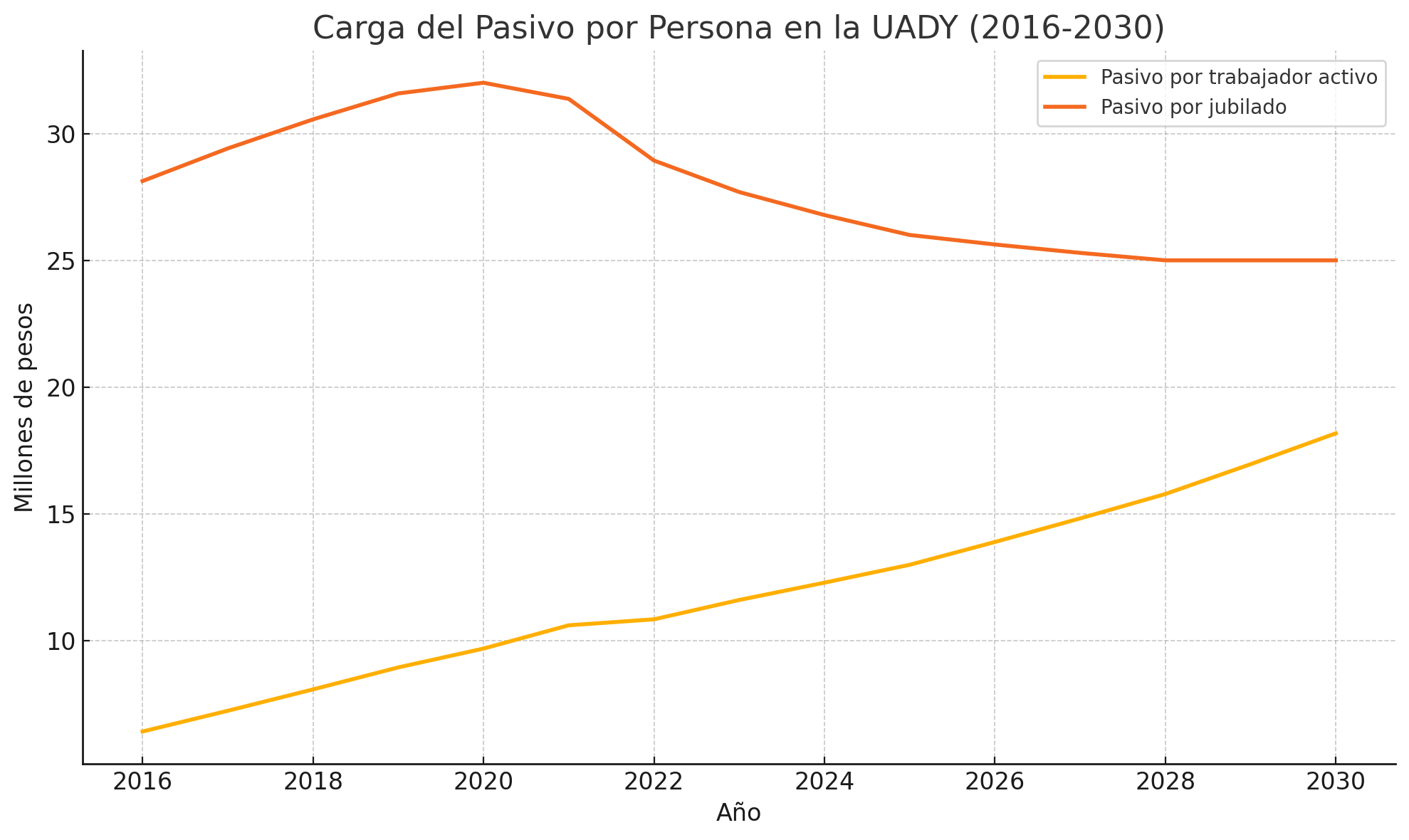 Tomando en cuenta la tendencia creciente del pasivo y la falta de fondos extraordinarios suficientes (como los que anteriormente proveía la federación a universidades públicas), los estimados indican que, entre 2027 y 2030, la UADY alcanzará un punto de inflexión donde los ingresos no cubrirán las jubilaciones pendientes. En ese lapso: